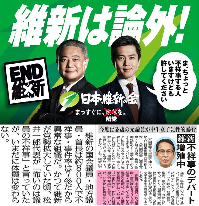 不祥事の報道は頑張っている証拠だ、そう思っている維新信者が大勢います。利権を擁護する政治を行えば、政治家にカネと権力が集中し、それは不祥事を増やします。維新にだけ不祥事が多いのは、なんら不思議ではない、必然なのです。