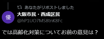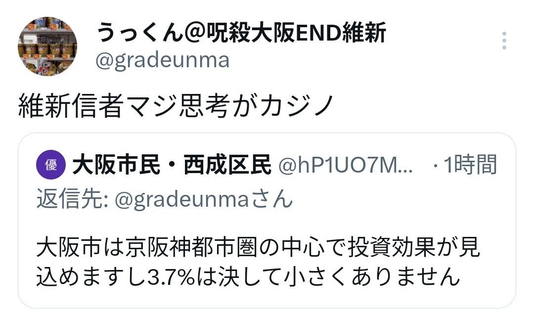 先日、Xで本当にあった押し問答を紹介します。維新信者は、高齢化に伴う社会保障費支出の増大に対応する目的で、大阪市(需要が見込める都市部)をドル箱にすることと、軍需産業を保護育成することを支持しています。大阪市の総生産は日本のGDPの3.7%に過ぎないと伝えても、投資効果が望めるから大阪市の総生産がGDPの3.7%でも決して小さくない、と言います。じゃあなぜ横浜市や名古屋市で同じことをしないのかと言うと、返事が返ってきませんでした。