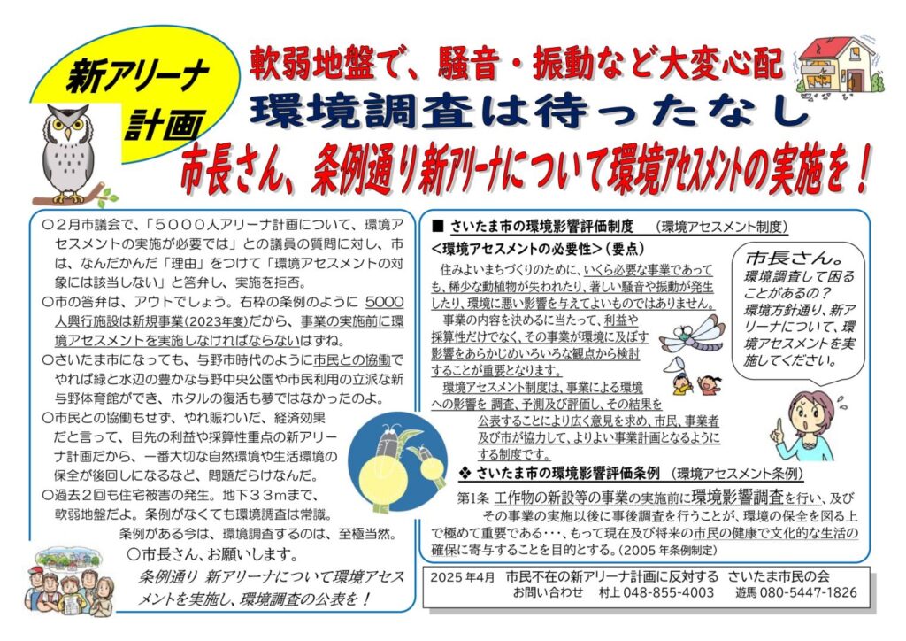 さいたま市がアリーナ計画を進めるにあたって、環境アセスメントを適切に実施し、市民の意見を十分に反映させることが重要です。そのために、以下のような対応が求められます。